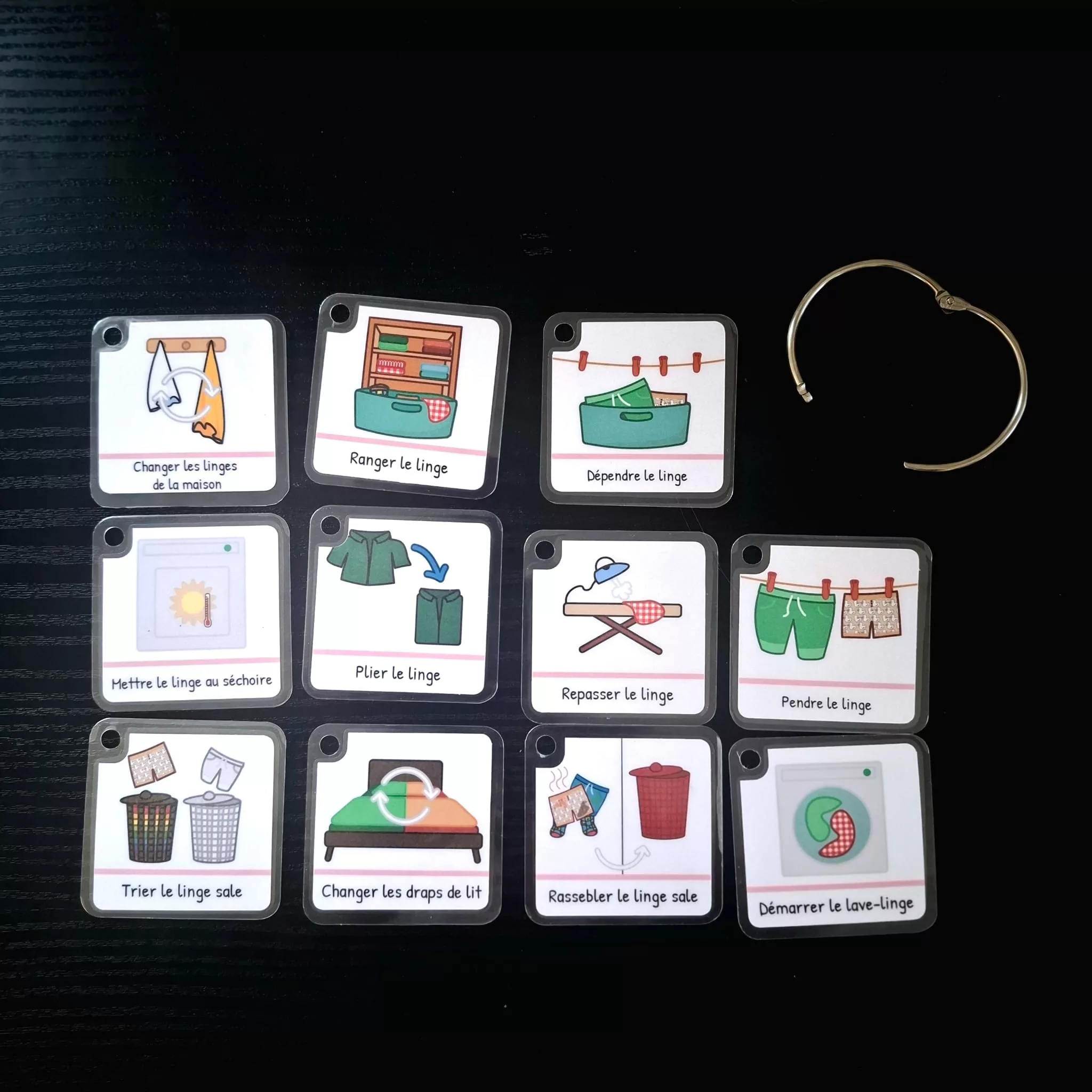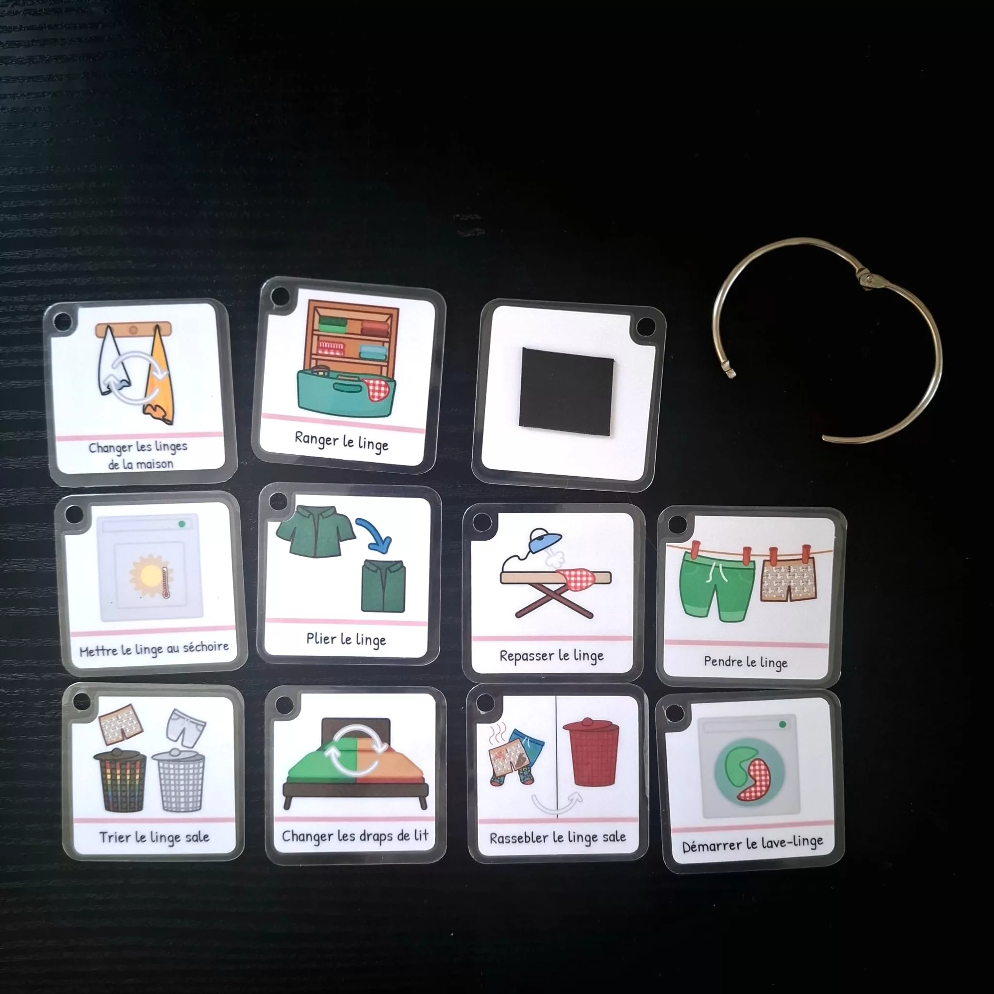 Placez les pictogrammes dans la buanderie ou utilisez-les sur un tableau blanc de tâches pour assigner les responsabilités à chacun. Pack picto lessive aide à instaurer une routine efficace et ordonnée pour l’entretien du linge. Les pictogrammes sont parfaits pour instaurer une routine de préparation des repas efficace et participative, où chaque membre de la famille sait exactement ce qu’il doit faire.