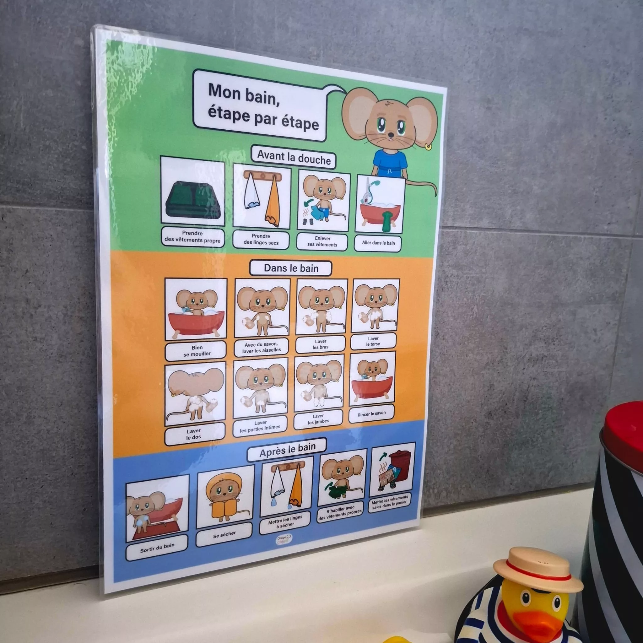 Ce support visuel montre les étapes du bain et accompagne les enfants dans leur routine de la douche en détaillant chaque étape, du début à la fin. Grâce à une présentation claire et structurée, il sert de rappel pour favoriser l’autonomie et la confiance en soi.