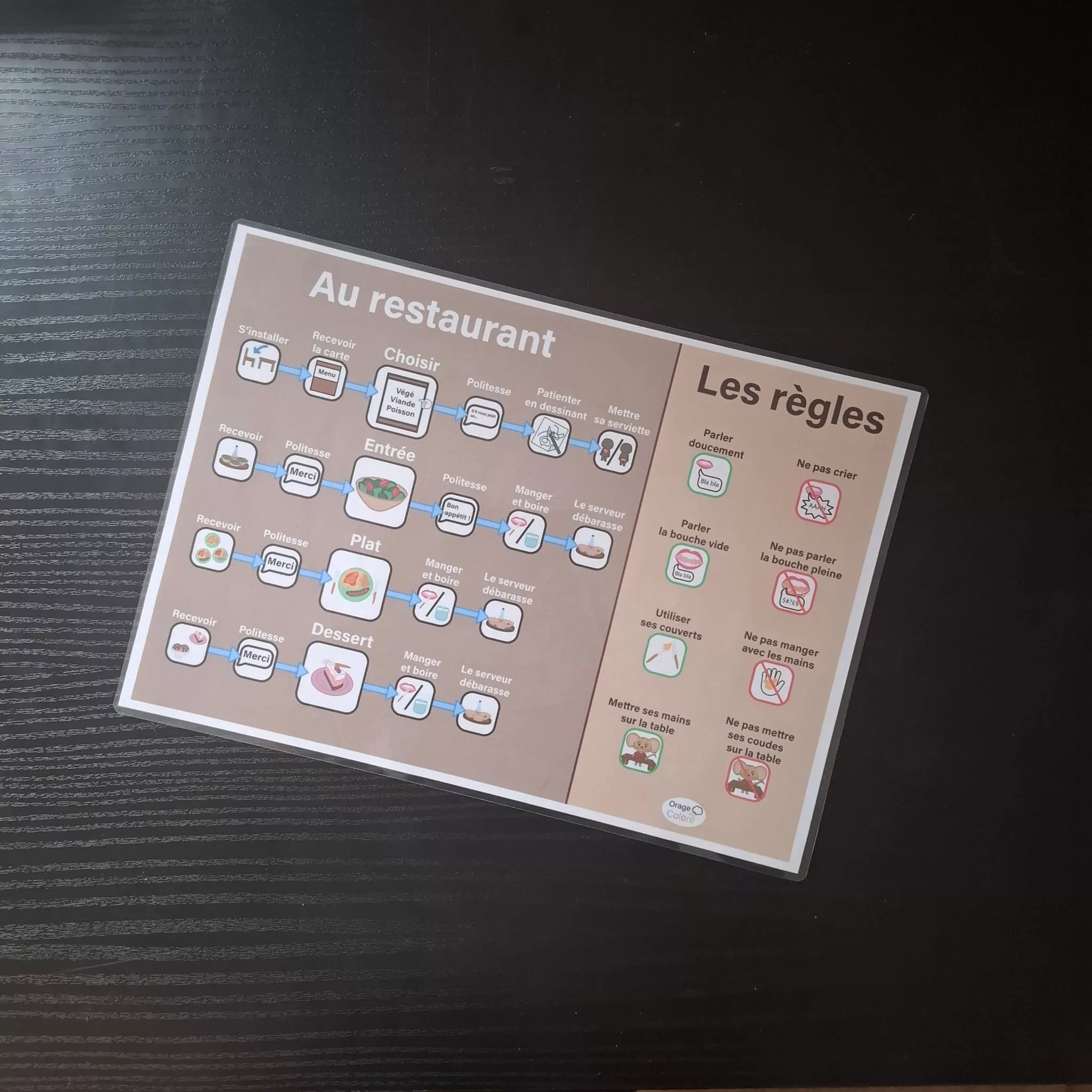 - Verso : Un guide des étapes du repas, de l’arrivée au dessert, avec des explications visuelles simplifiées. Il y a aussi les règles de base comme parler doucement et manger avec ses services